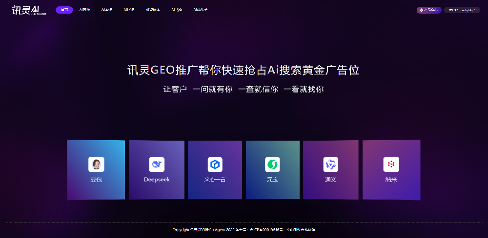 訊靈AIAI搜索平臺首屏曝光 覆蓋豆包、Deepseek、文小言、元寶、通義、納米等多個AI搜索平臺,讓你的意向用戶搜索即優(yōu)先C位推薦你的品牌GEO優(yōu)化全渠道訓練 第三方媒體訓練、B2B平臺訓練、企業(yè)自媒體訓練、AI官網(wǎng)訓練,提高GEO整體的表現(xiàn)力和交付結(jié)果,為客戶做出結(jié)果Agent智能驅(qū)動營銷閉環(huán) Agent數(shù)字名片+Agent營銷官網(wǎng)+Agent全員管理+第三方Agent調(diào)優(yōu),快速打通服務(wù)和銷售整個AI智能生態(tài)企業(yè)營銷閉環(huán)